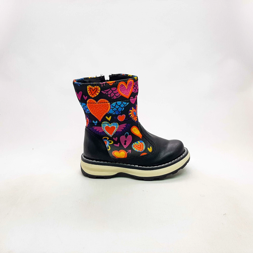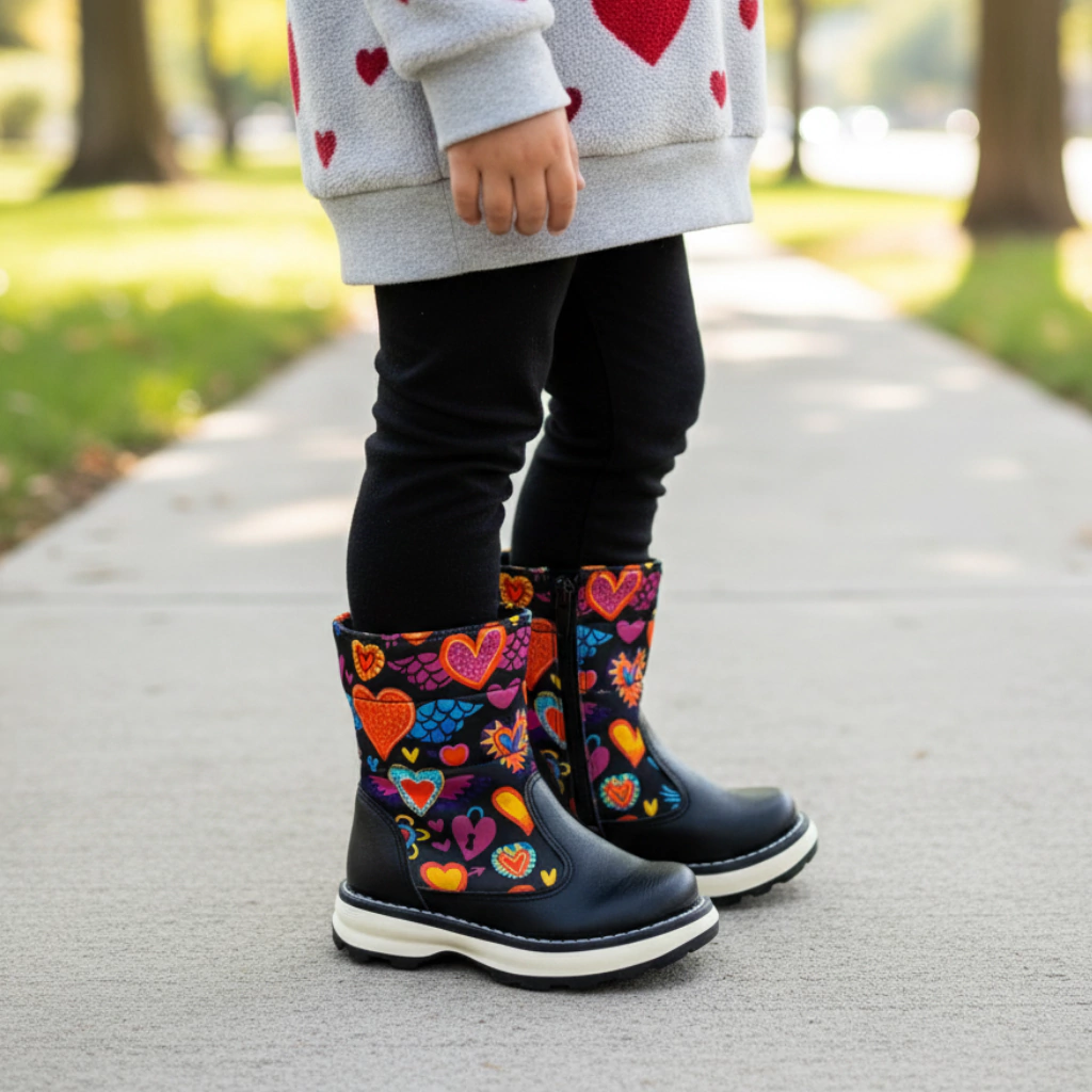 La Bota Infantil Negra con Estampado de Corazones es la opción perfecta para quienes buscan abrigo y resistencia sin renunciar a un look alegre y divertido.
