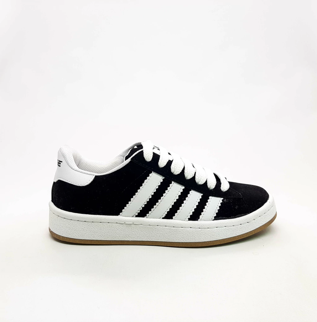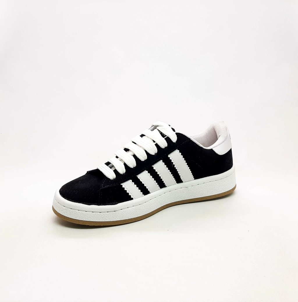 La Zapatilla Urbana Negra de Gamuza con Tiras Blancas es la opción perfecta para quienes buscan un básico infaltable sin renunciar a la comodidad de todos los días.