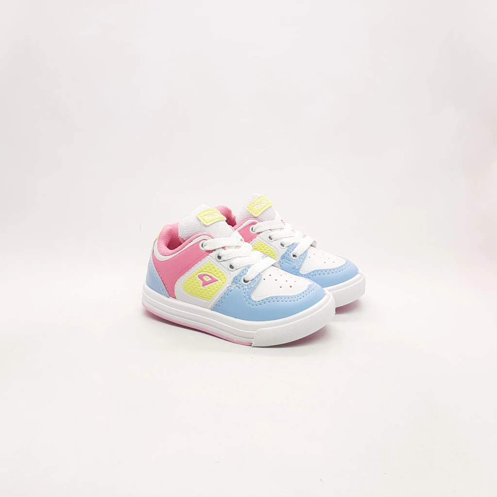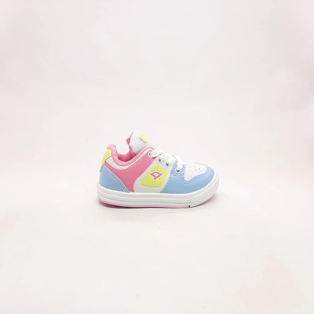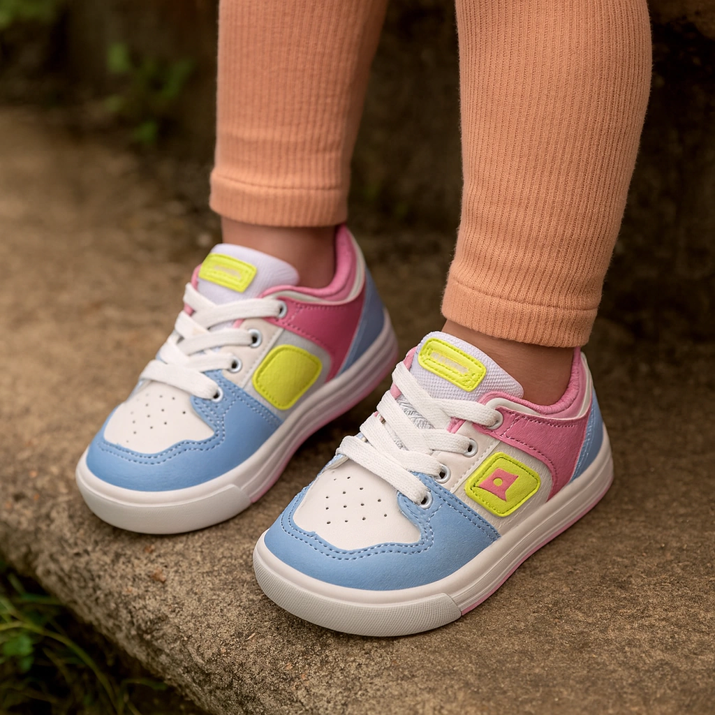 ✔️ Capellada combinada: paneles en rosa, celeste y amarillo pastel sobre base blanca que le dan personalidad a cada outfit.