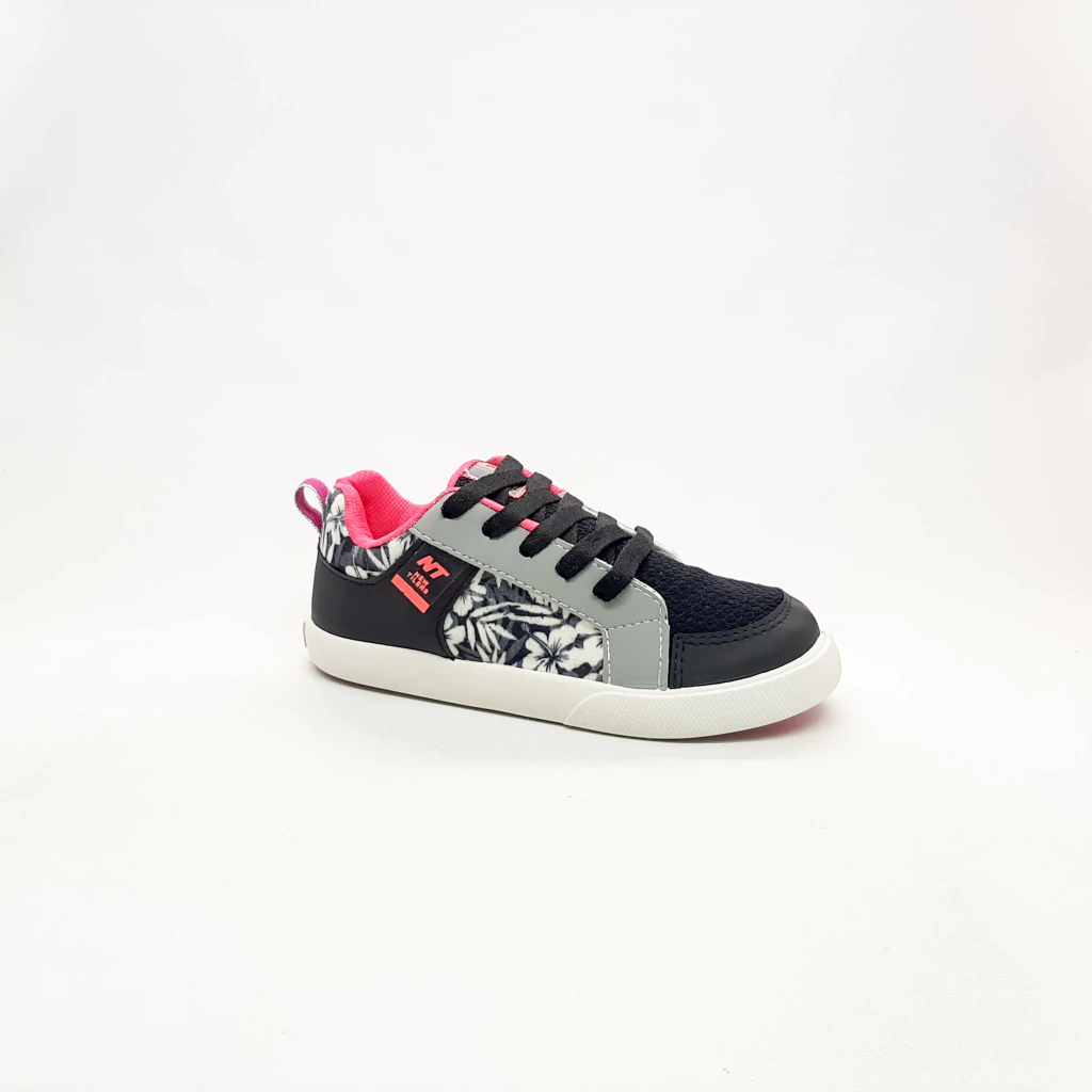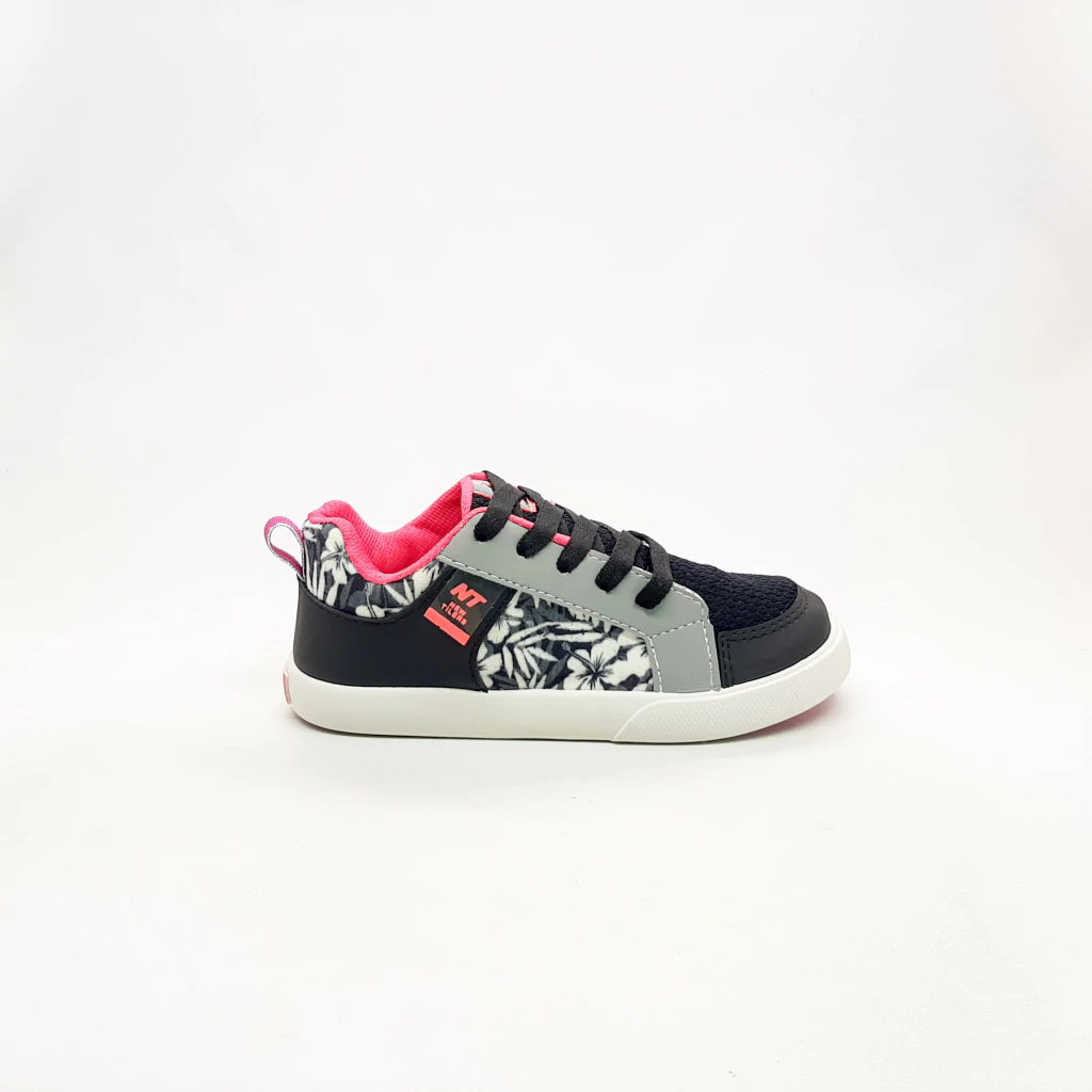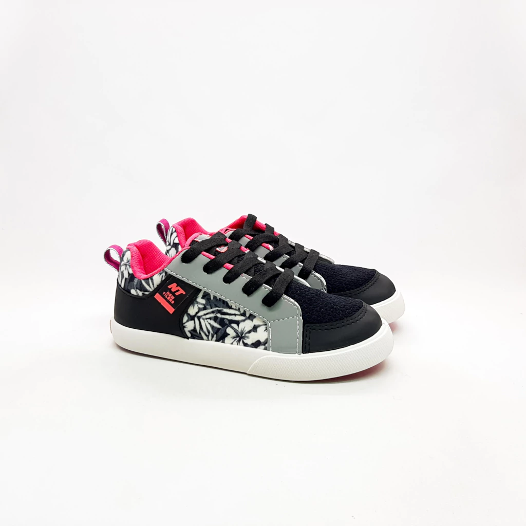 Color: negro con gris, estampa floral B&N y detalles fucsia; suela blanca.