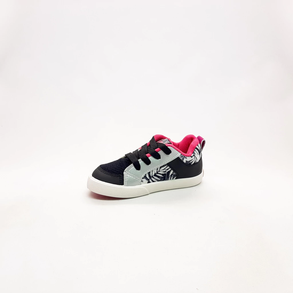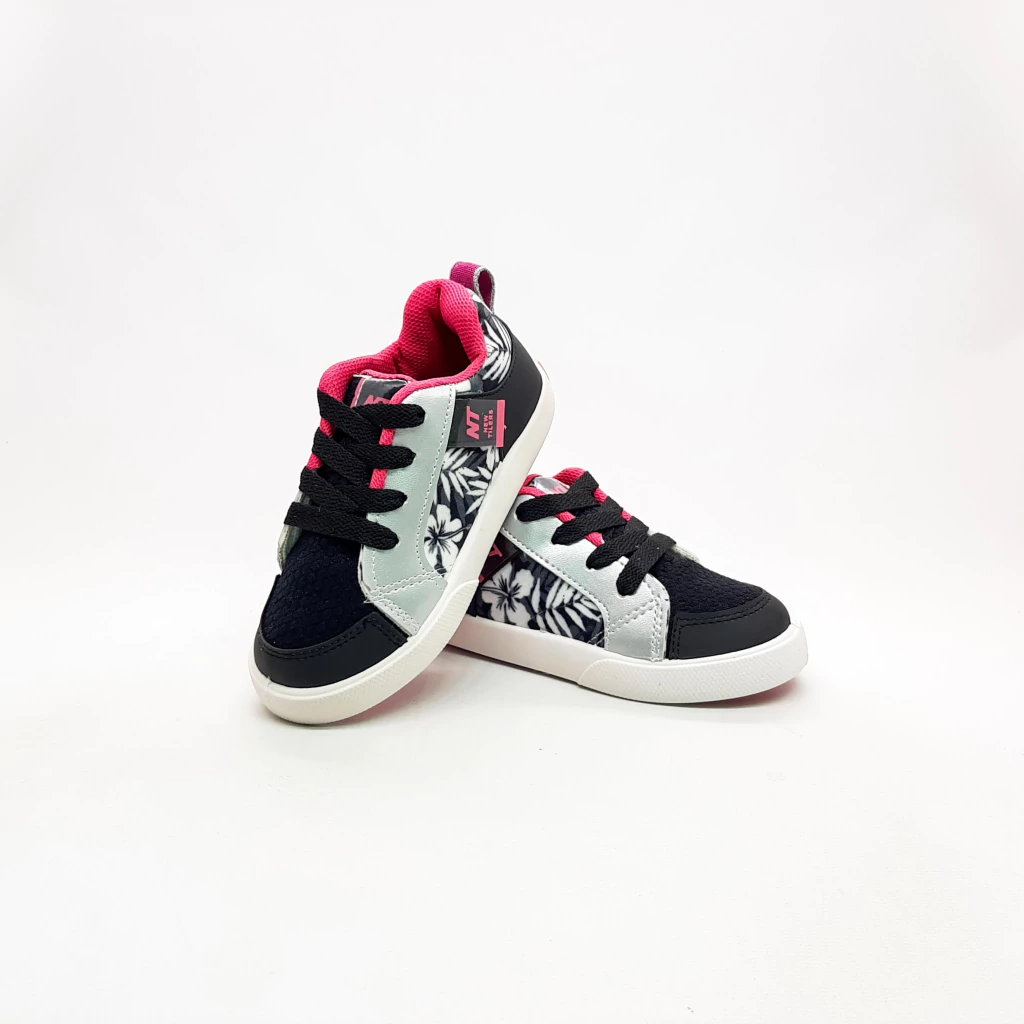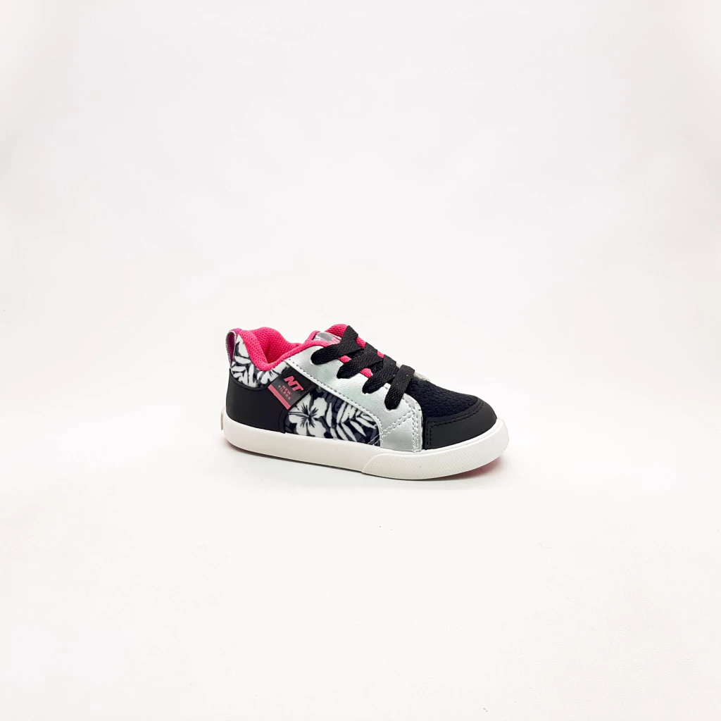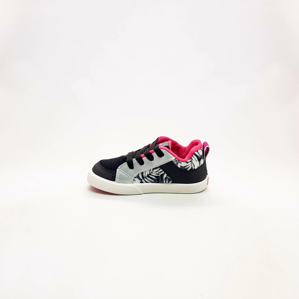 Color: negro con gris, estampa floral B&N y detalles fucsia; suela blanca.
